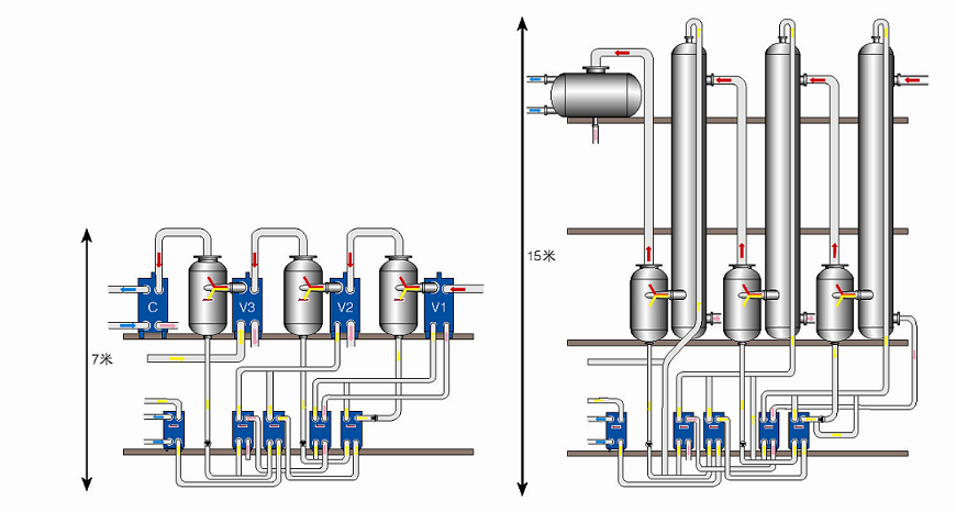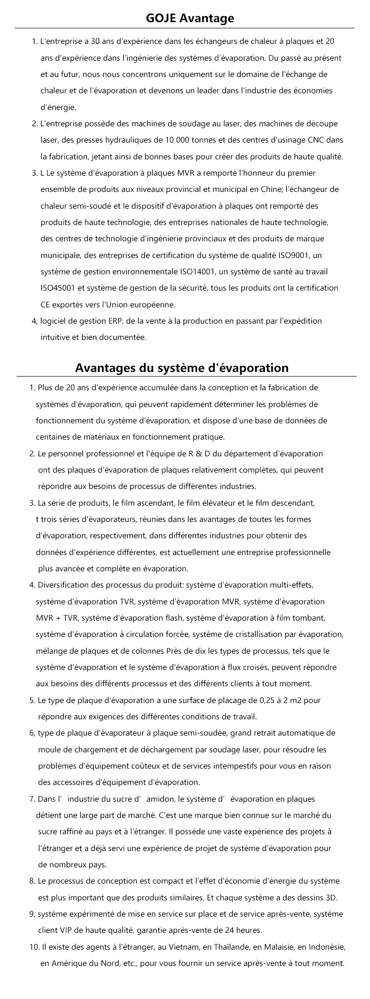 Evaporateur à film tombant:Chaque groupe est constitué de deux plaques de formes différentes, le matériau entre par les ouvertures gauche et droite situées à l'extrémité supérieure de la plaque et le mélange vapeur-eau sort par le milieu de l'extrémité inférieure; la vapeur entre par la grande bouche au milieu de l'extrémité supérieure de la plaque et l'eau condensée sort par l'extrémité inférieure et l'ouverture. L'ondulation à faible résistance est utilisée pour répartir uniformément le milieu. La résistance est faible et le rendement élevé.
